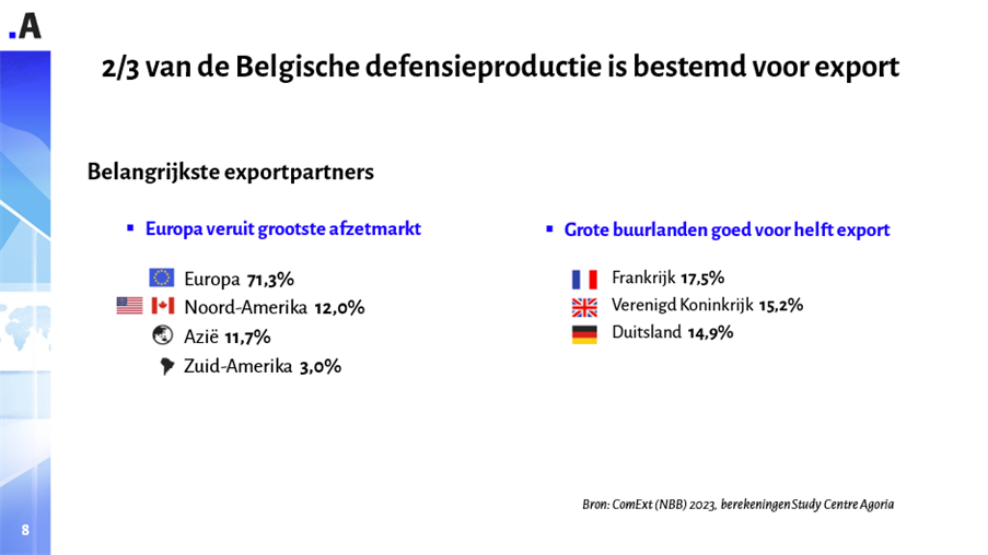 Meer dan twee derde van wat defensiebedrijven produceren, wordt geëxporteerd. 71,3% daarvan gaat naar Europa, 12% naar Noord-Amerika en 11,7% naar Azië. De grootste exportpartners voor de Belgische defensie-industrie zijn de grote buurlanden: Frankrijk neemt 17,5% van de export voor zijn rekening, het VK en Duitsland respectievelijk 15,2% en 14,9%. Samen zijn zij dus goed voor de helft van alle Belgische defensie-export.