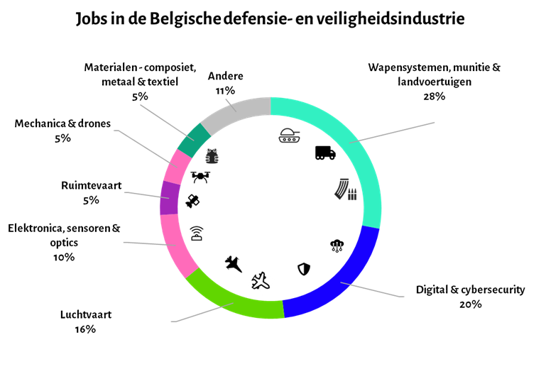 De Belgische defensie- en veiligheidssector is bijzonder divers. Bekijken we de verdeling op basis van het aantal jobs, springen de 3 grootste categorieën eruit: wapensystemen, munitie en landvoertuigen nemen 28% van de jobs voor hun rekening, gevolgd door digitale diensten & cybersecurity met 20% en de luchtvaartindustrie met 16%. Maar de defensie-industrie is nog veel breder dan dat: daarna volgen elektronica (bijvoorbeeld sensoren en nacht- of warmtekijkers) met 10%, ruimtevaarttechnologieën, mechanica en drones, materialen (composiet, metalen en textiel zoals bv. kogelvrije vesten), elk met 5%. Een brede groep van andere bedrijven is nog goed voor de resterende 11% jobs. Daarin vinden we o.a. onderzoekscentra, onderwatermijnbestrijding en trainings- en simulatiesystemen.